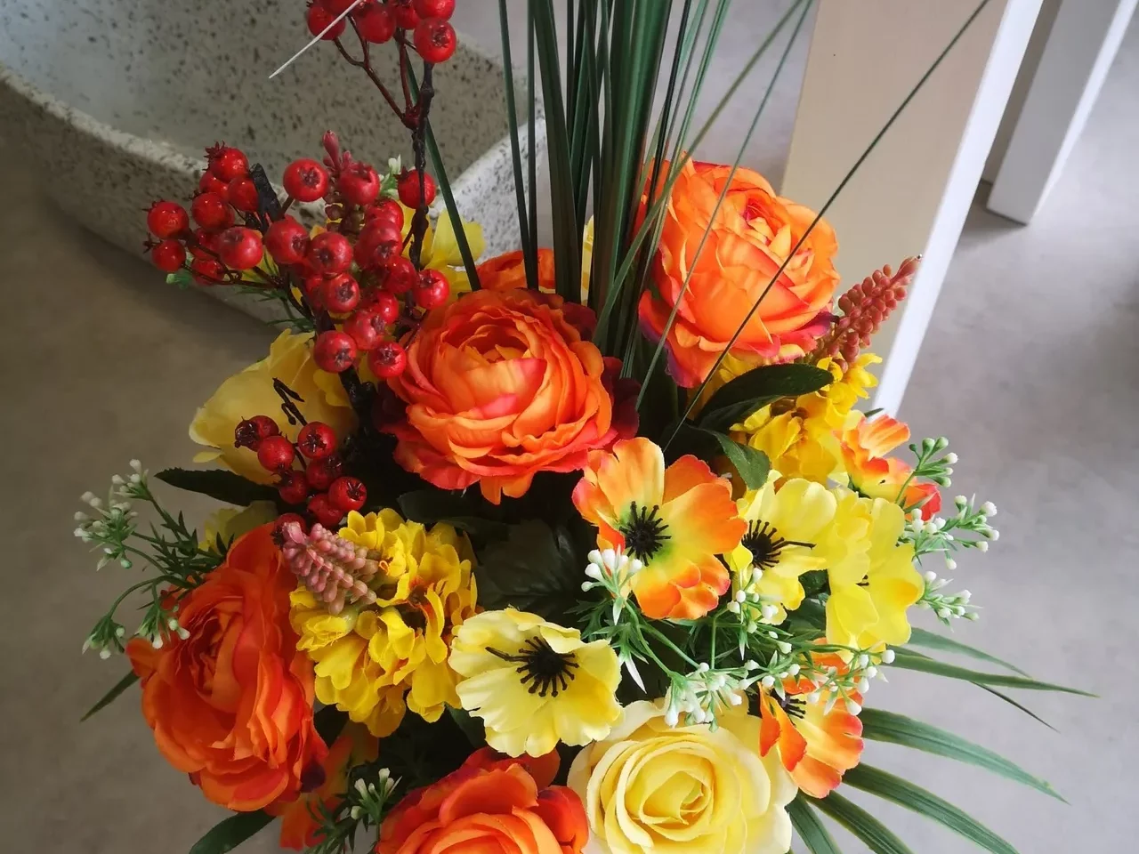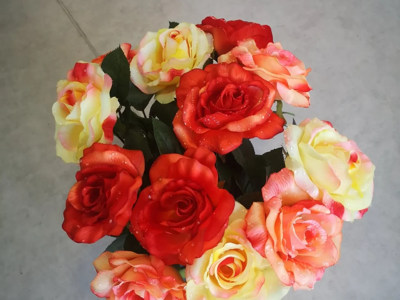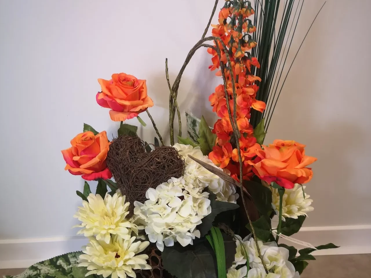 Coupe avec pot en céramique : Roses orange rouge et jaune
