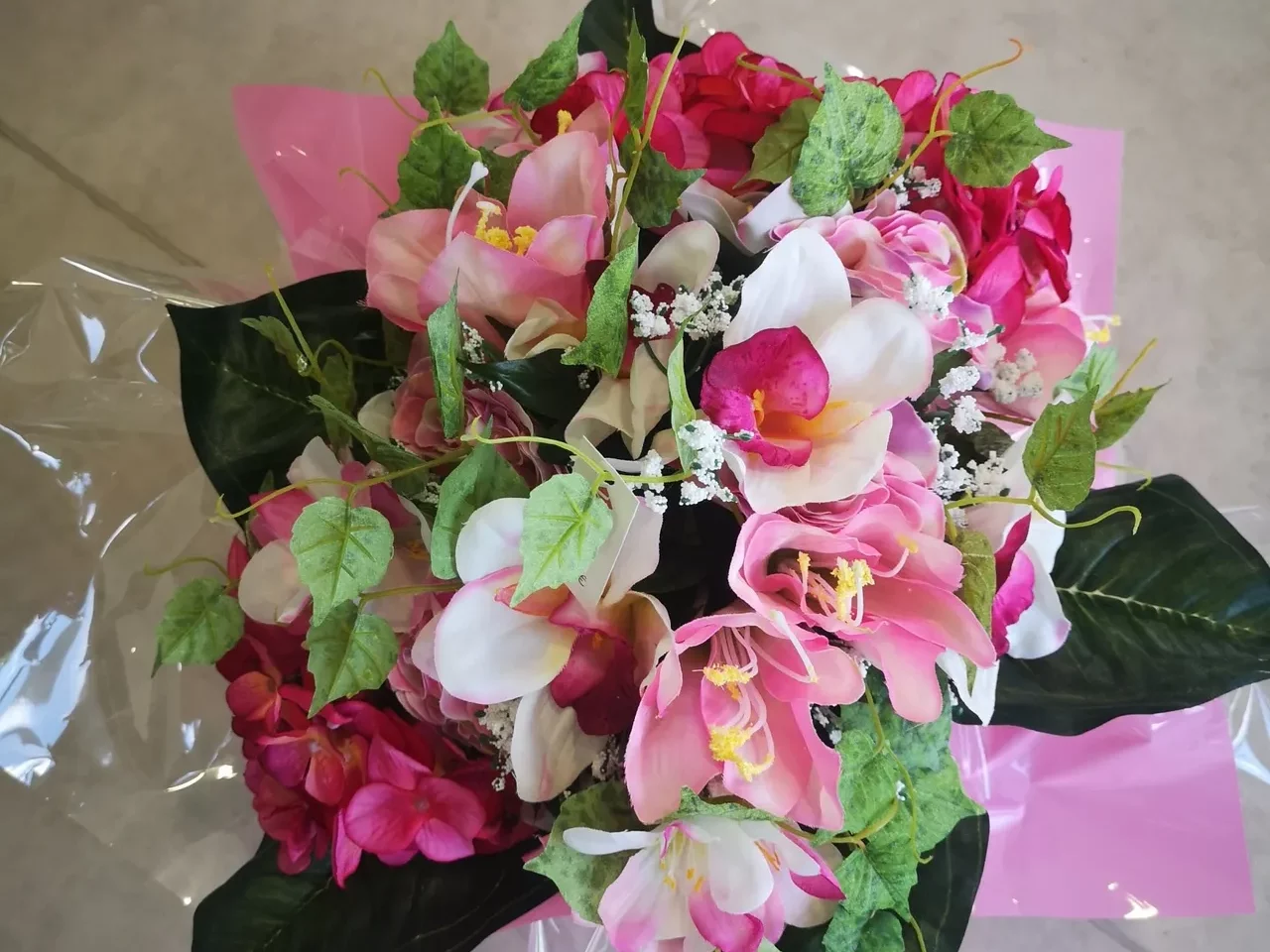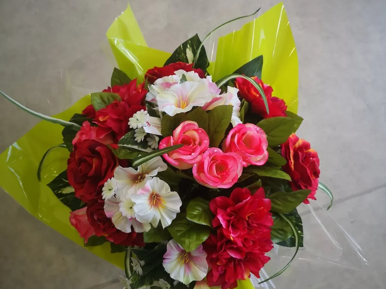Bouquet imitation bulle d’eau : tons rouge, blanc, rose